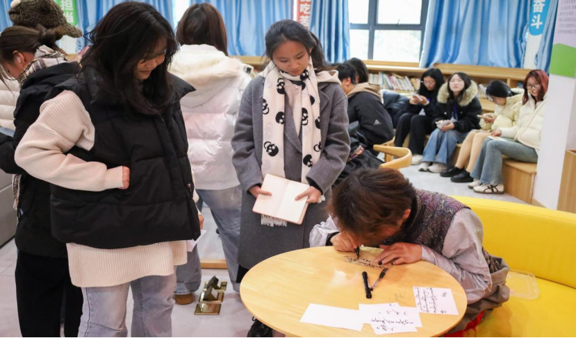 互动环节将现场气氛推向高潮。工作人员分发好书写纸片后,学生们纷纷围拢在藏族学生身边,请教藏文的写法。环境工程2024(2)班的吴攸拿着手里的纸牌翻看,纸牌一面是她的藏文名字,一面是藏文祝福,“这个写的是万事如意”她指着字样补充,“下次再见到这个藏文词语,我就能认出来了。”