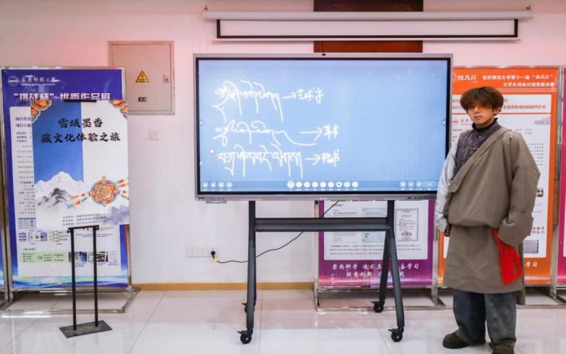 地理科学2024(2)班的格桑朗杰以“扎西德勒”为示例,向大家展示了藏文的艺术字、草书、楷书等多种字体,引得在场学生阵阵赞叹。