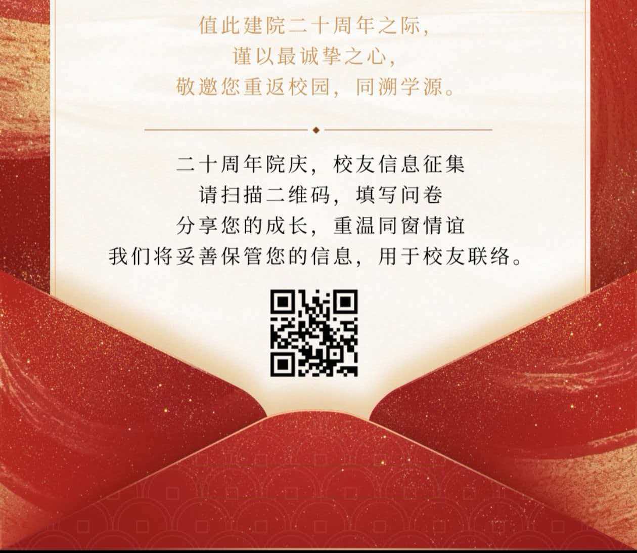 亲爱的校友,二十周年院庆,是学院发展史上的重要里程碑,更是全体校友抚今追昔、再叙情谊、共谋发展的荣耀盛典。为让这场跨越山海的团圆圆满落幕,让沉淀二十年的情感永续传承,我们特此向全体校友发出诚挚倡议: